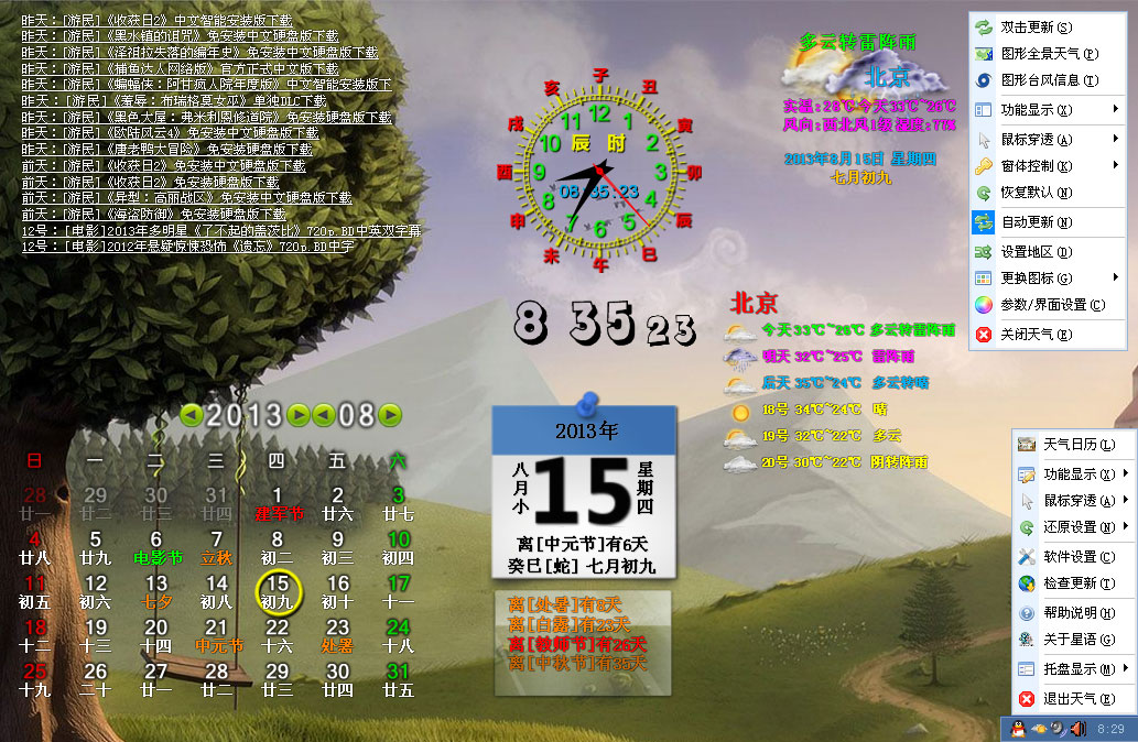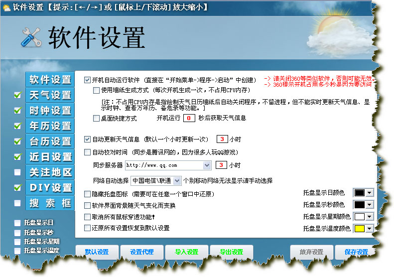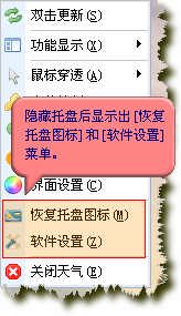 新添多功能托盘(温度、日期、星期、秒);支持自定义图型;动态天气图形;提醒闹钟;全新的功能设置面板等等.....