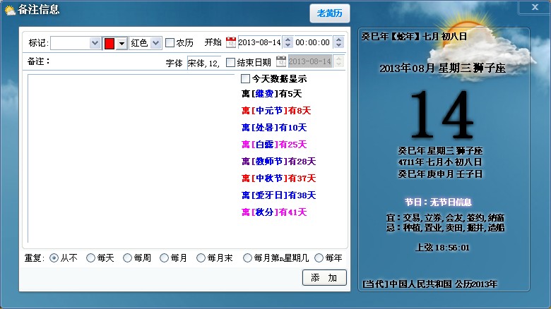 新添万年历(包含农历、节日、备注等功能);