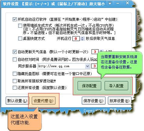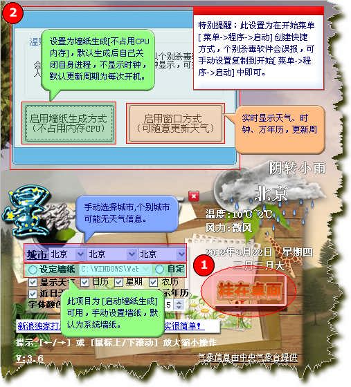 下图是软件主功能设置界面图解,(注:使用墙纸生成方式运行需要在下次开机才会生效,不显示时钟、自动更新天气等功能,不过每次开机能自动更新。),如果电脑比较慢的请设置开机预先准备时间周期,建议设置在5-15秒之内。自动更新天气、校对时间周期建议设置在3-8小时之内,同步服务器选择按个人需要设置;