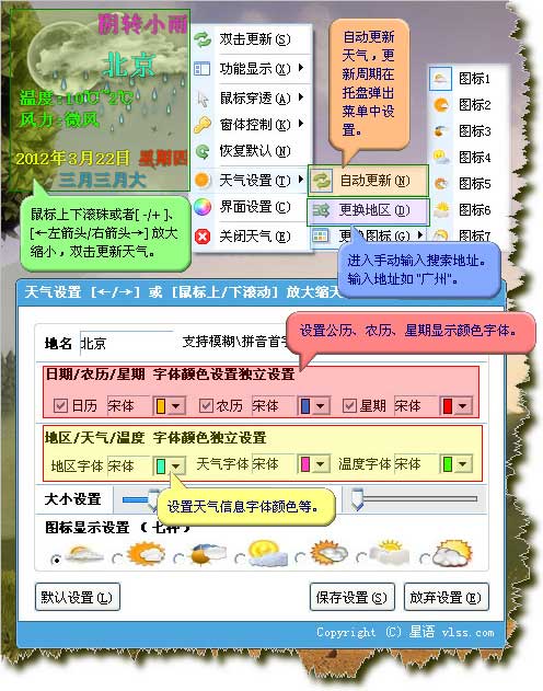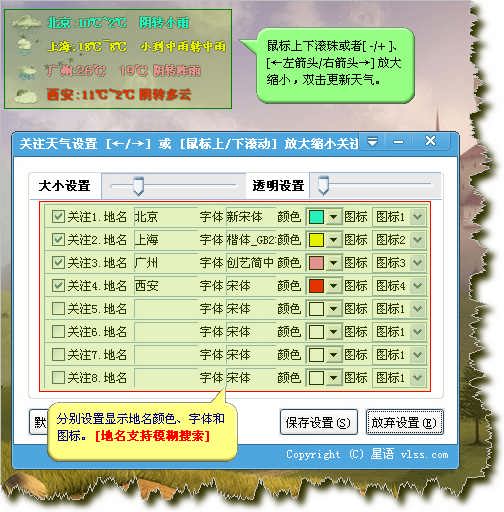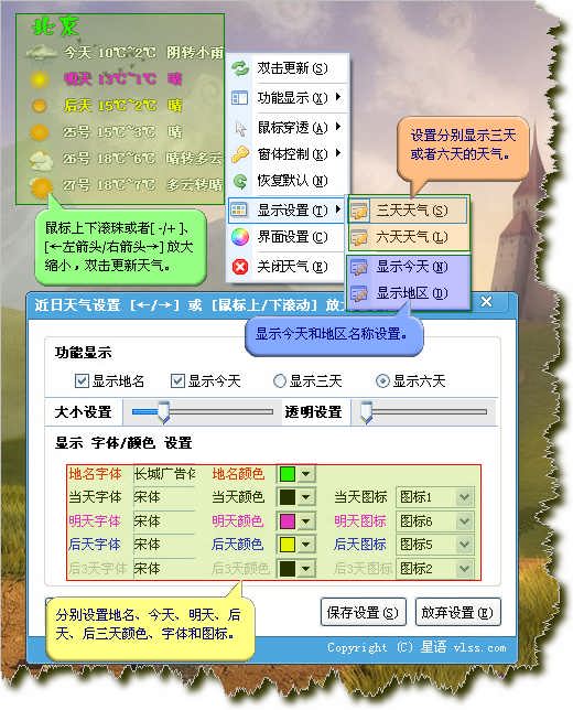 下图是桌面天气详细图解,此次更新支持图标独立选择与文本颜色字体设置;