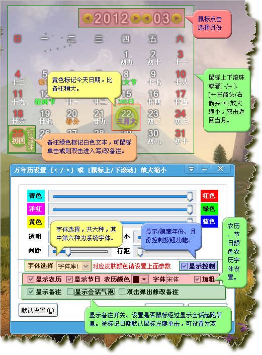 桌面月历支持横版和传统版显示,附带备忘功能,可设置6种字体和颜色等显示;