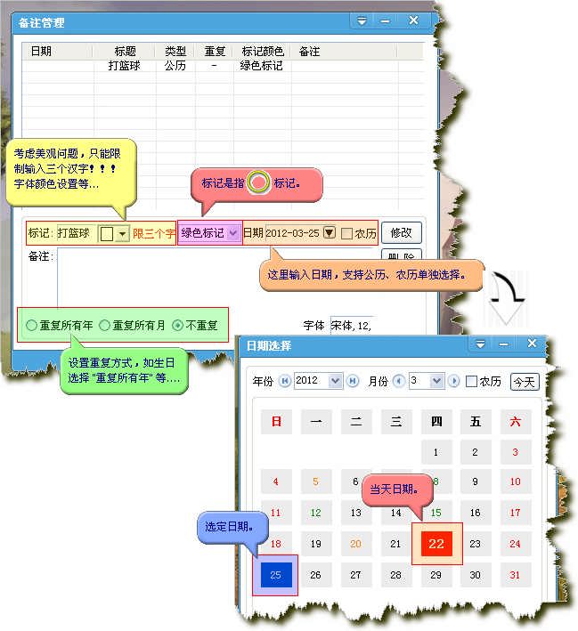 重新制作备注功能,支持万年历中显示与对应时间选择和操作,