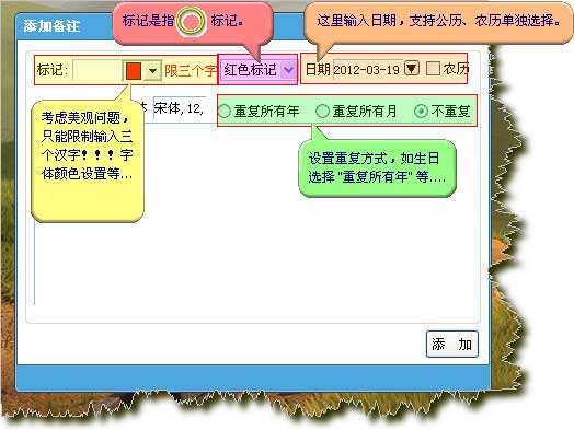 新添提示栏功能,支持节日和备忘提醒功能;
