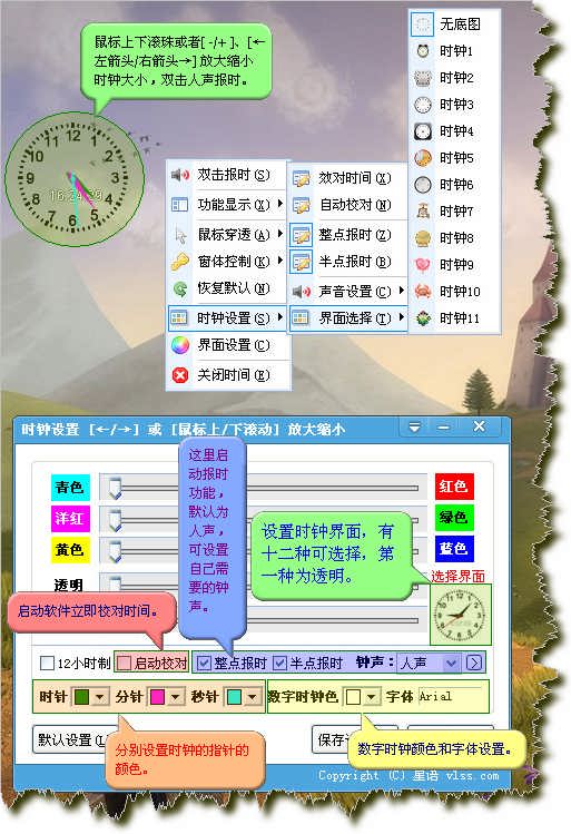 下图是时钟详细图解,支持12种风格选择,多种钟声选择;